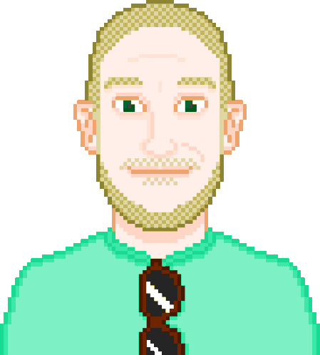 A pixel art animation featuring a comedian with a beard and sunglasses, subtly looking around. Perfect for comedy fans.