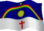 Waving flag of Pernambuco, a Brazilian state, featuring a blue field, rainbow, sun, star, and a red cross on a white stripe.