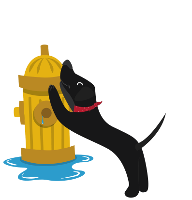 Perro Matapacos, the black dog, playfully interacts with a leaking yellow fire hydrant, creating a puddle.