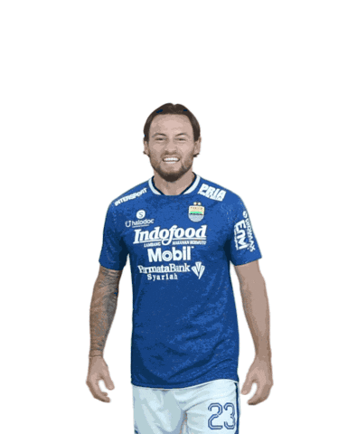 Marc Klok, the Persib Bandung player, celebrates with an excited cheer and pumped fists, showing his team spirit.