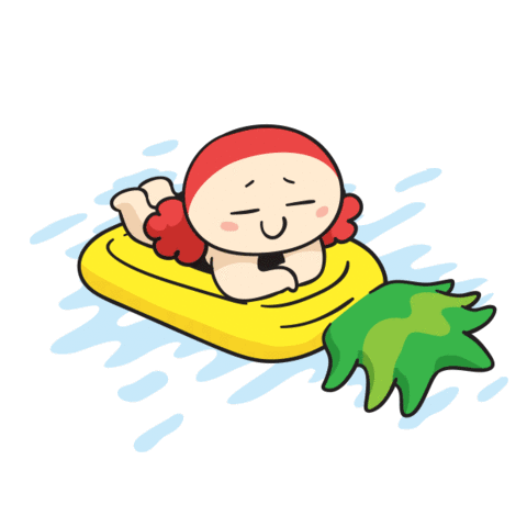 A cute cartoon character with a red swim cap relaxes, floating peacefully on a yellow inflatable raft in the water.