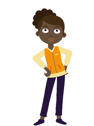 A cartoon girl with dark skin and hair, wearing an orange vest and purple pants, standing with hands on hips and occasionally gesturing.