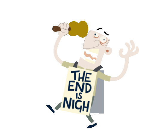 A frantic cartoon pessimist ringing a bell and wearing a 'THE END IS NIGH' sandwich board, expressing doomsday warnings.