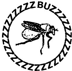 An animated logo sticker for Pest Collective, featuring a bee illustration within a circular border of rotating 'BUZZ' text.