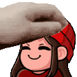 Pixel art animation of Aimsey Pat gently patting her head, wearing a red hat and a dog-head hat.