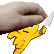 GingerBrave from Cookie Run receives a peculiar pet pat from a hand holding a knife, a humorous and slightly mischievous moment.