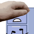 A hand gently pets Cabby from Inanimate Insanity, a blue filing cabinet with a friendly face.