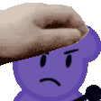 A hand gently places a small party hat on a sad-faced purple teddy bear, a classic 'Pet Pet Petpet' moment.