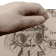 Pet Petpet features a close-up of a hand holding a piece of paper with a simple, expressive face drawing on it.