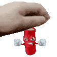 A hand holds the angry red firecracker character Pettardinni from Petardosteam, ready to explode with frustration.