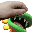 Petey, a green snake with sharp teeth, is held in a hand, moving its head and mouth.
