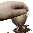 An animated hand gently pets Robbie, the Axe Boy character, as he sits in a small cup.
