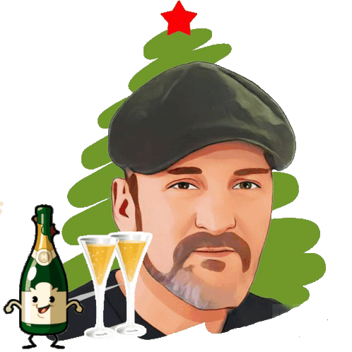 Петр Никитин celebrates New Year with a festive Christmas tree, a cheerful champagne bottle, and two glasses.