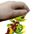 A pixel art animation of a hand gently petting Gnarpy, a green, frog-like creature with large eyes.
