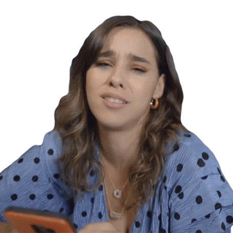 a woman in a blue polka dot dress is holding a cell phone and making a funny face .
