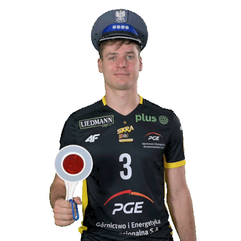 Wiktor Nowak, a PGE Skra volleyball player, wears a police hat and uses a stop sign, referencing 'policjant'.