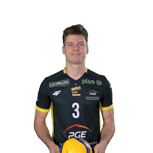 Volleyball player Wiktor Nowak of PGE Skra Bełchatów spinning a volleyball on his finger, showcasing his skill.
