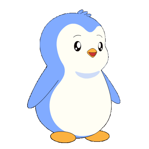 a blue and white penguin with orange feet and a yellow beak