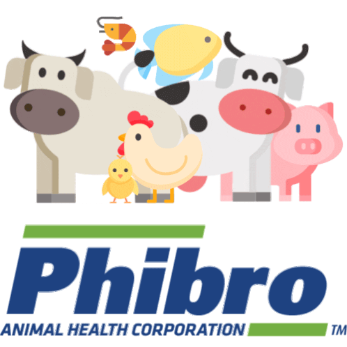 Phibro Animal Health Corporation logo with cartoon farm animals like cows, chickens, pigs, and aquatic animals.
