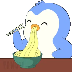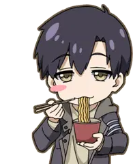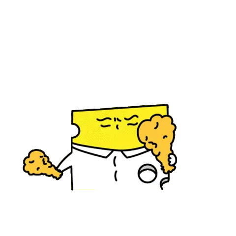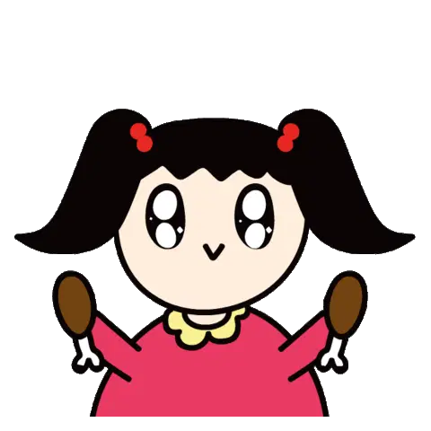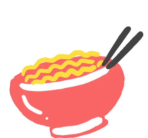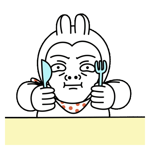 A hungry character with bunny ears eagerly awaits a mukbang feast of noodles, fried chicken, and chocolate cake, ready with a fork.
