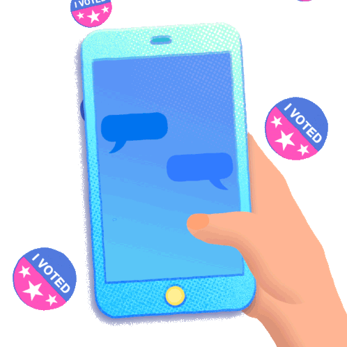 A hand holds a smartphone displaying 'PHONEBANK FOR TERRY' in a chat bubble, surrounded by floating 'I VOTED' stickers.