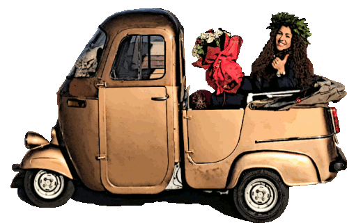 A happy woman with a leafy wreath and flowers celebrates in the back of a classic Piaggio Ape, making a shaka gesture.