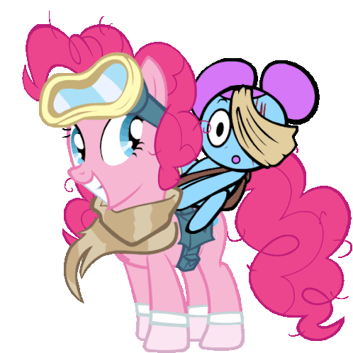 Pinkie Pie from My Little Pony carries Pibby on her back, ready for an adventure. Pibby looks a bit worried.