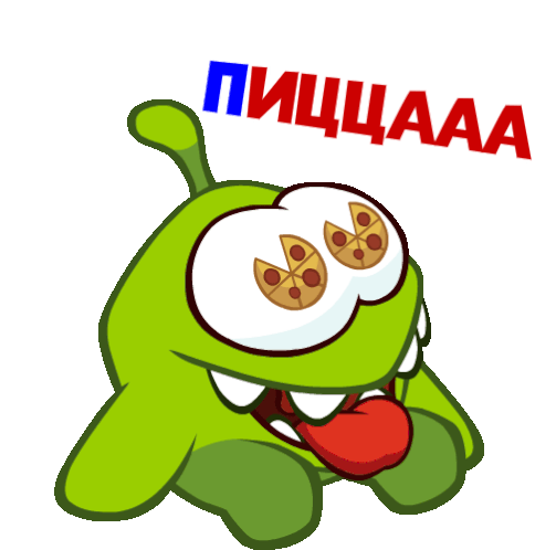 Om Nom from Cut the Rope is absolutely craving pizza, with pizza slices even appearing in his eyes as he shouts "PIZZAAA!".