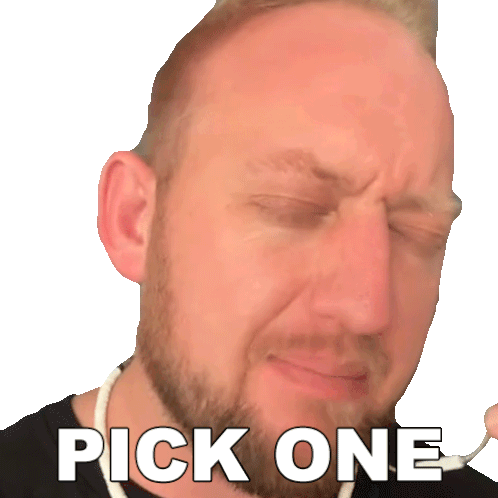 Dj Hunts makes a funny, pained expression with his eyes closed, while the text 'PICK ONE' appears below him.