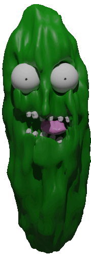 An animated sticker featuring a grotesque green pickle character with large eyes, teeth, and a tongue, zooming in.