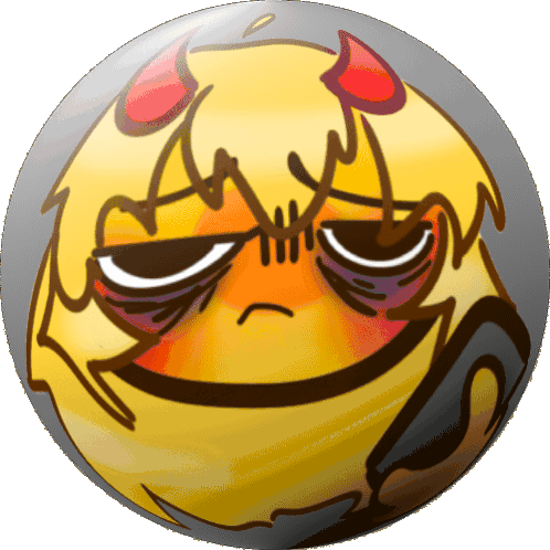 Picklebloom Picklesus, a cartoon devil face with red horns, slowly rotates, showing its tired expression.