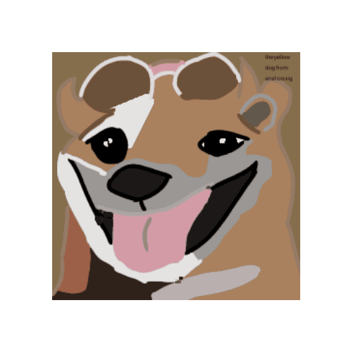 Picky Picky From Dogelore, a smiling dog character with sunglasses on its head and tongue out, featuring text "the yellow dog from smallcorgi".