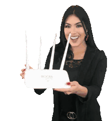 Pierina Boom happily presents a white WiFi router, smiling and pointing at the device with enthusiasm.