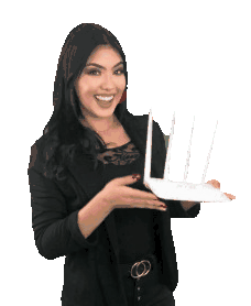 Pierina Boom, smiling brightly, enthusiastically presents a white WiFi router, showcasing connectivity.