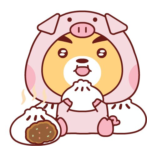 Adorable character in a pink pig costume happily eating a steaming hot baozi, with another delicious bun nearby.