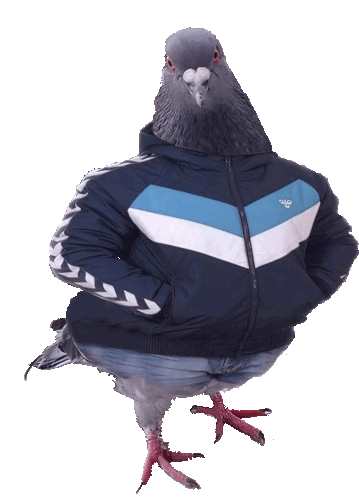 A funny cartoon pigeon with big eyes dances energetically, with the letter 'I' floating above its head.
