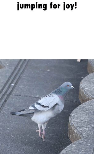 A cute pigeon bounces happily on a concrete surface with the caption 'jumping for joy!'