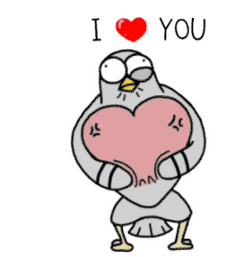 A humorous pigeon with a human-like body wears a blue tracksuit jacket and jeans, standing with hands in pockets, conveying a 'Love You' message.