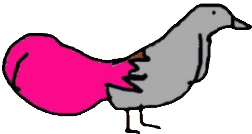 A cartoon pigeon with a grey body and a strikingly large, vibrant pink tail, standing still in a unique style.