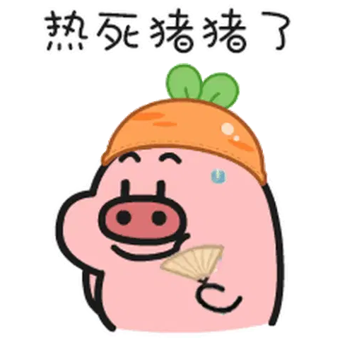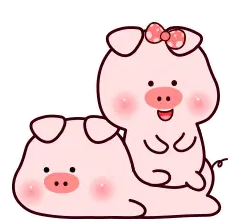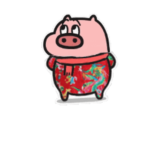 A cute pink cartoon pig wearing a vibrant red floral shirt and matching scarf, looking up with a curious expression.