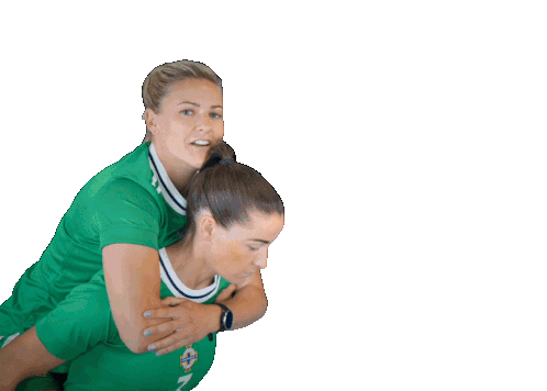 Nadene Caldwell gives Demi Vance a joyful piggyback ride, both smiling in their Northern Ireland football jerseys.