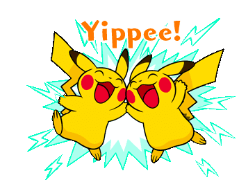 Two adorable Pikachu jump with joy and excitement, exclaiming 'Yippee!' with bright smiles and electric sparks.