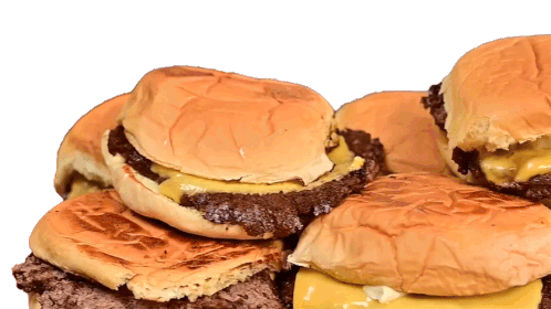 A mouth-watering animated sticker featuring a large pile of delicious cheeseburgers, presented by The Hungry Hussey.