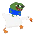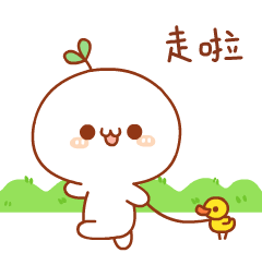 A cute cartoon character with a sprout on its head walks happily, pulling a small yellow duckling on a leash. Text says 'Let's go!'