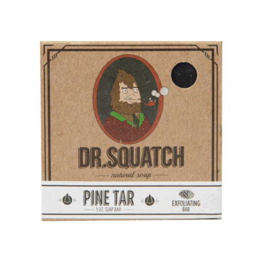 A Dr. Squatch Pine Tar natural soap bar, an exfoliating bar with a distinctive bearded man logo.