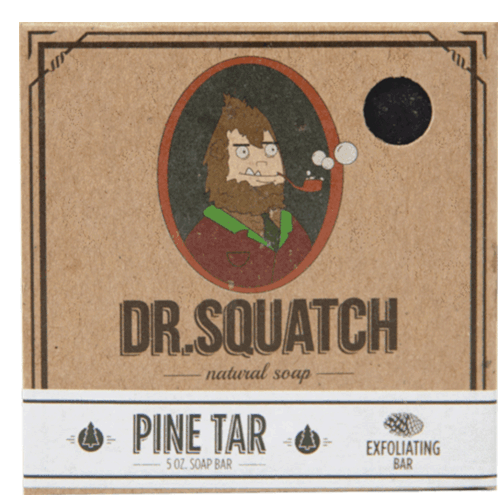 Dr. Squatch Pine Tar natural soap box featuring a cartoon Bigfoot character and exfoliating bar details.