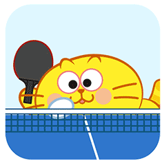 A chubby yellow cartoon cat with big eyes and pink cheeks peeks over a blue ping pong table net, sticking its tongue out playfully.