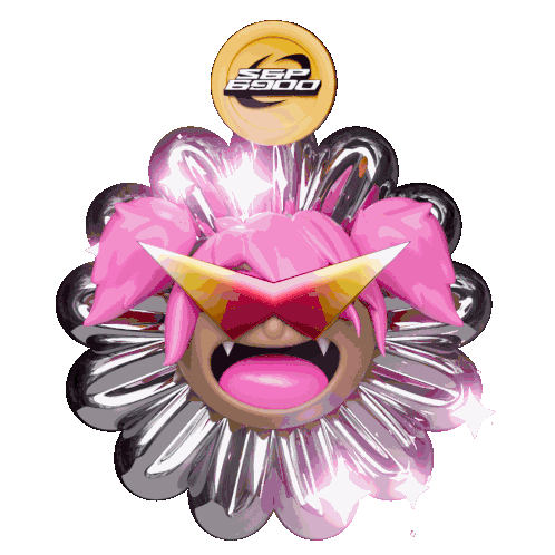 Animated sticker of a pink-haired character with sunglasses, fangs, surrounded by chrome petals, featuring an SPX6900 coin.