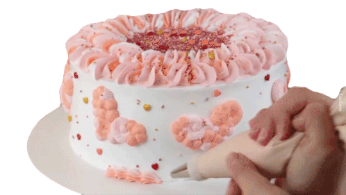 A hand expertly pipes pink icing onto a white cake, creating delicate heart shapes and decorative swirls.