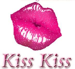 a close up of a pink kiss with the words kiss kiss written below it